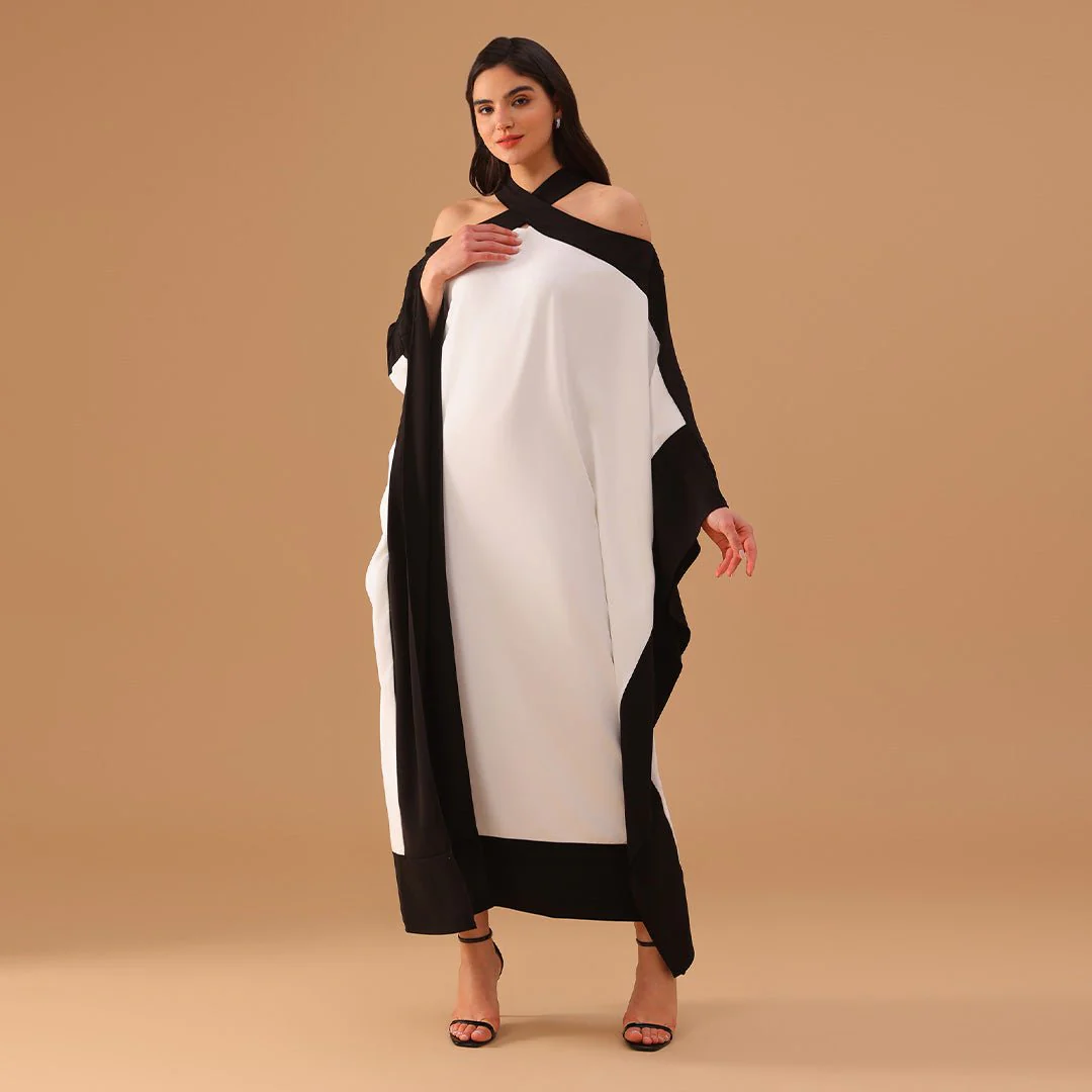 This black and white crepe kaftan brings a refined yet relaxed feel with its flowing cut and halter neck design. The contrast borders frame the silhouette elegantly, while the loose drape allows for ease of movement and all-day comfort. It’s a statement piece that works beautifully for formal gatherings or upscale evening events.