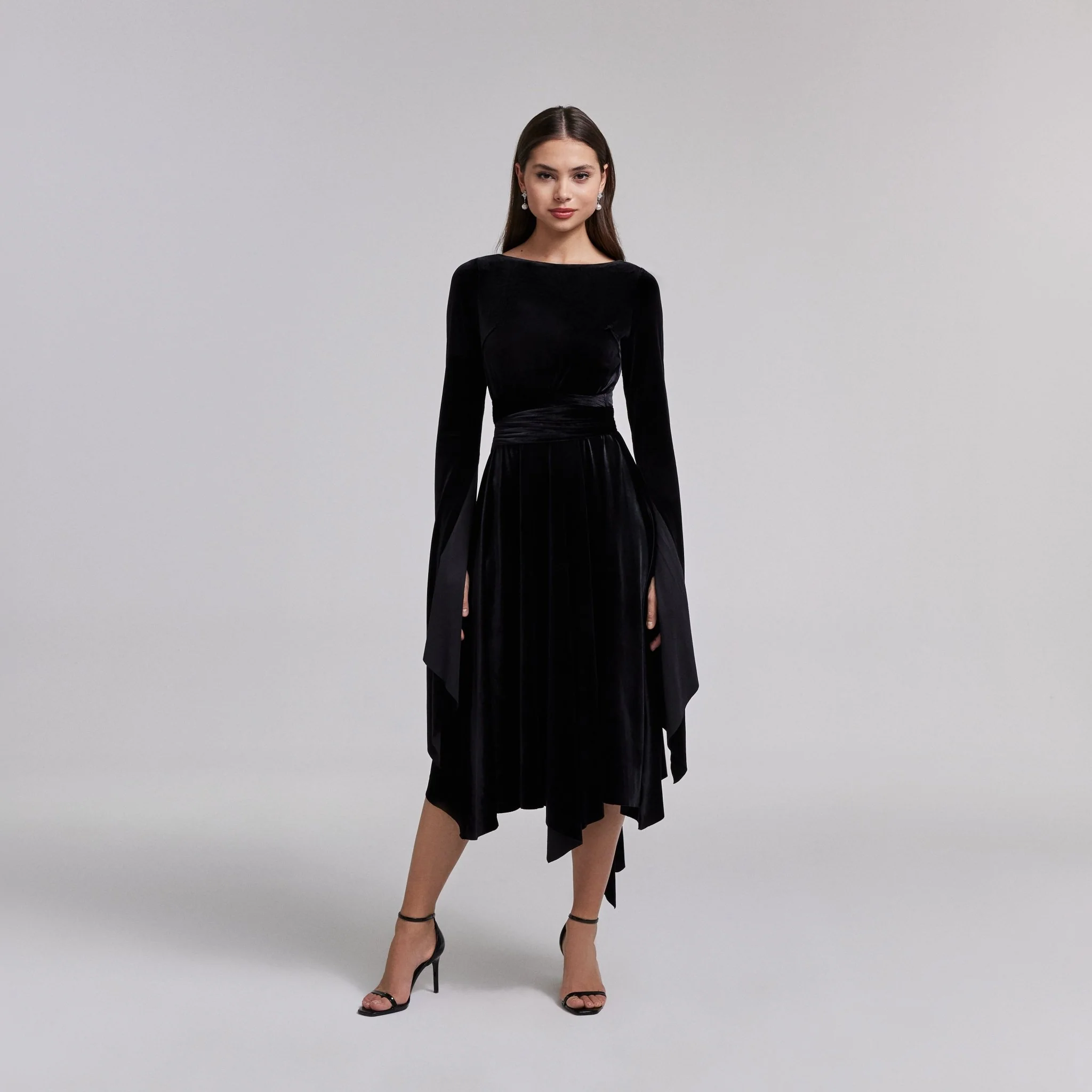 This velvet maxi dress combines sculpting detail with fluid movement. Designed with a twist-effect waist belt in matching fabric, the shape can be slightly adjusted from the back, allowing a custom fit without sacrificing elegance. The cape-inspired long sleeves with wide hems add quiet drama, while the handkerchief hemline creates natural flow with every step. A practical choice for evening occasions where comfort and structure need to coexist.