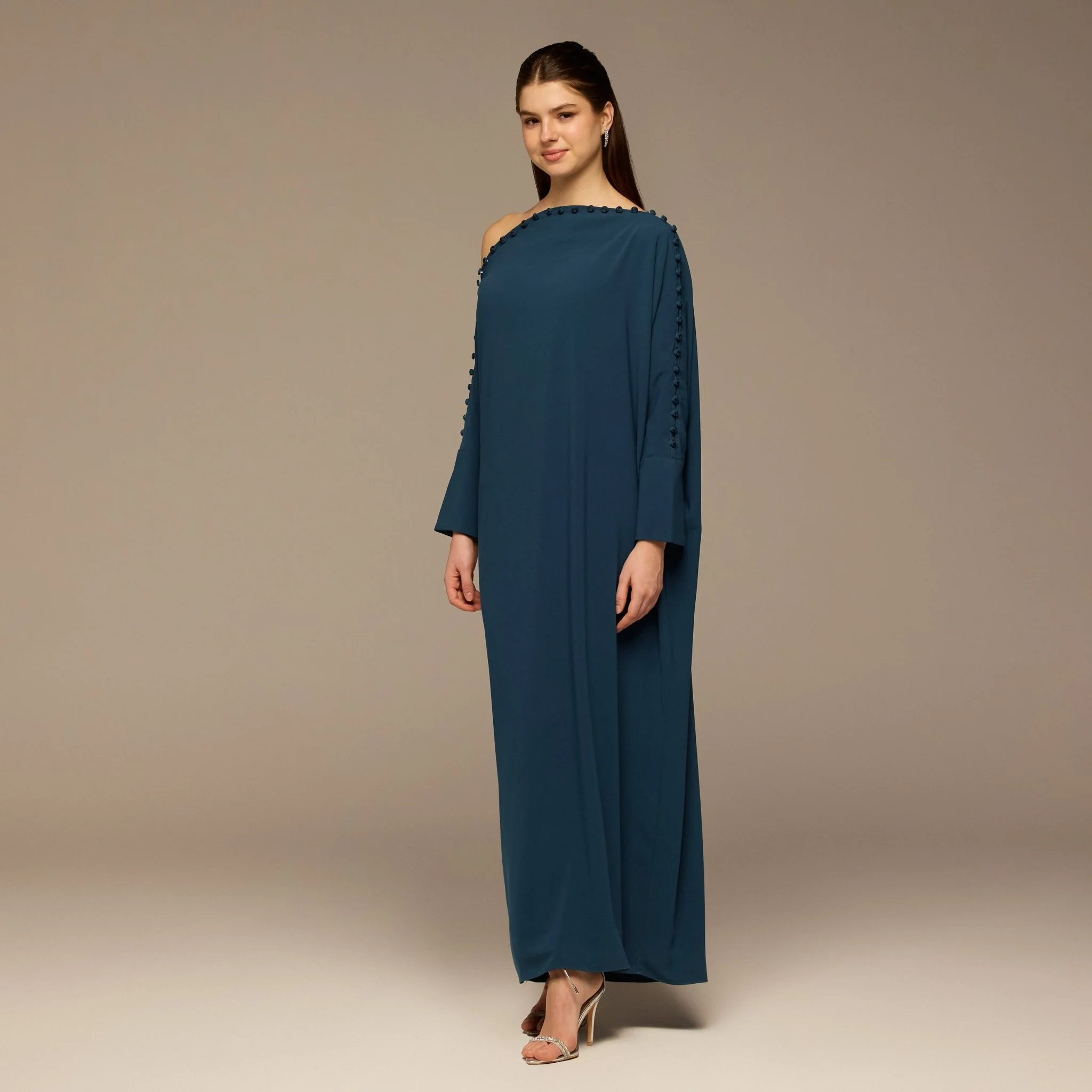 This asymmetric crepe kaftan offers a relaxed, flowy fit with a unique side-draped shape that feels comfortable while adding subtle structure. The shoulder button detailing draws the eye upward, giving a lifted effect without adding volume.