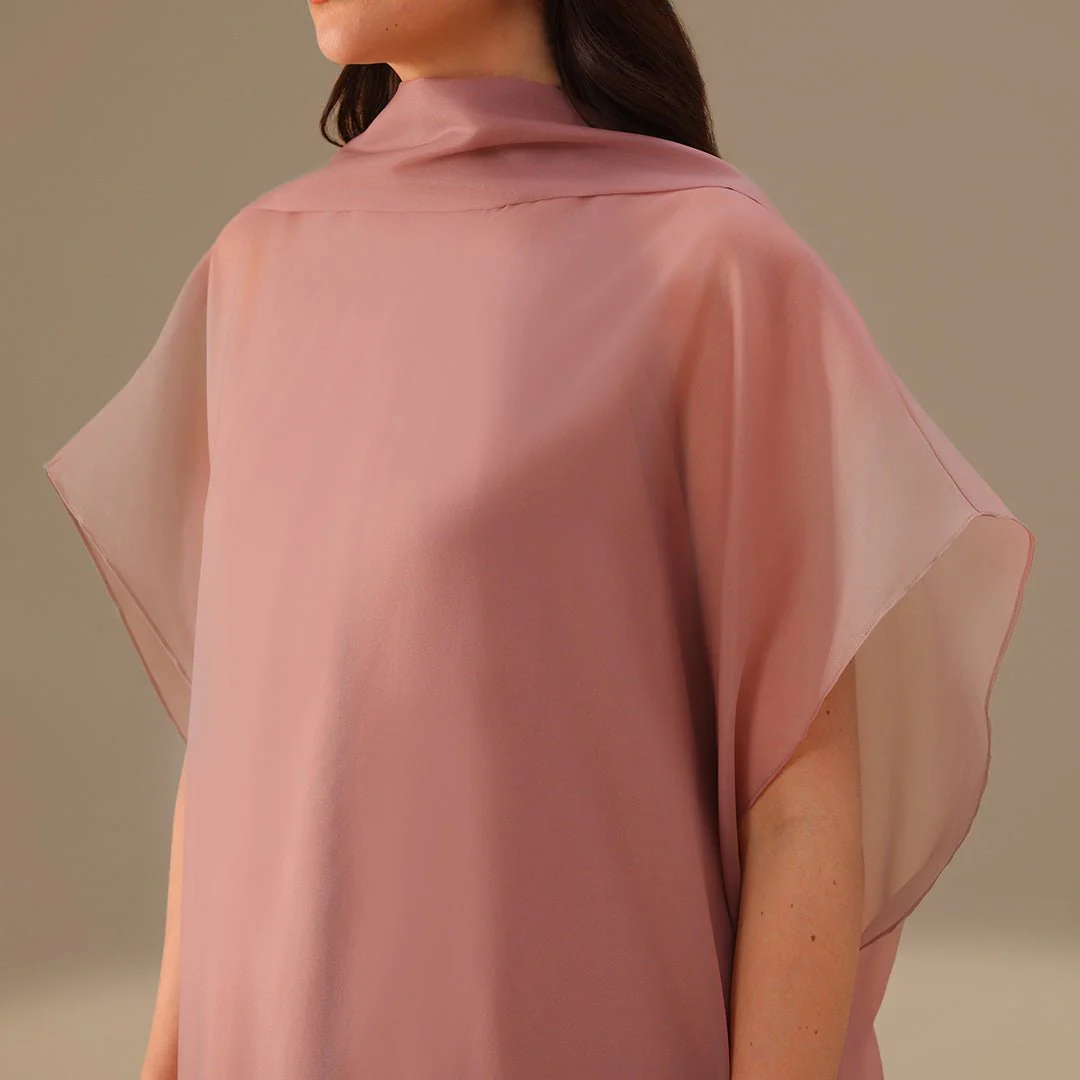 This high-neck maxi dress pairs clean lines with soft movement. The inner crepe dress offers full coverage with a smooth A-line cut, while the sheer georgette cape flows effortlessly over the shoulders and down the back. A built-in scarf detail adds elegance without the fuss.