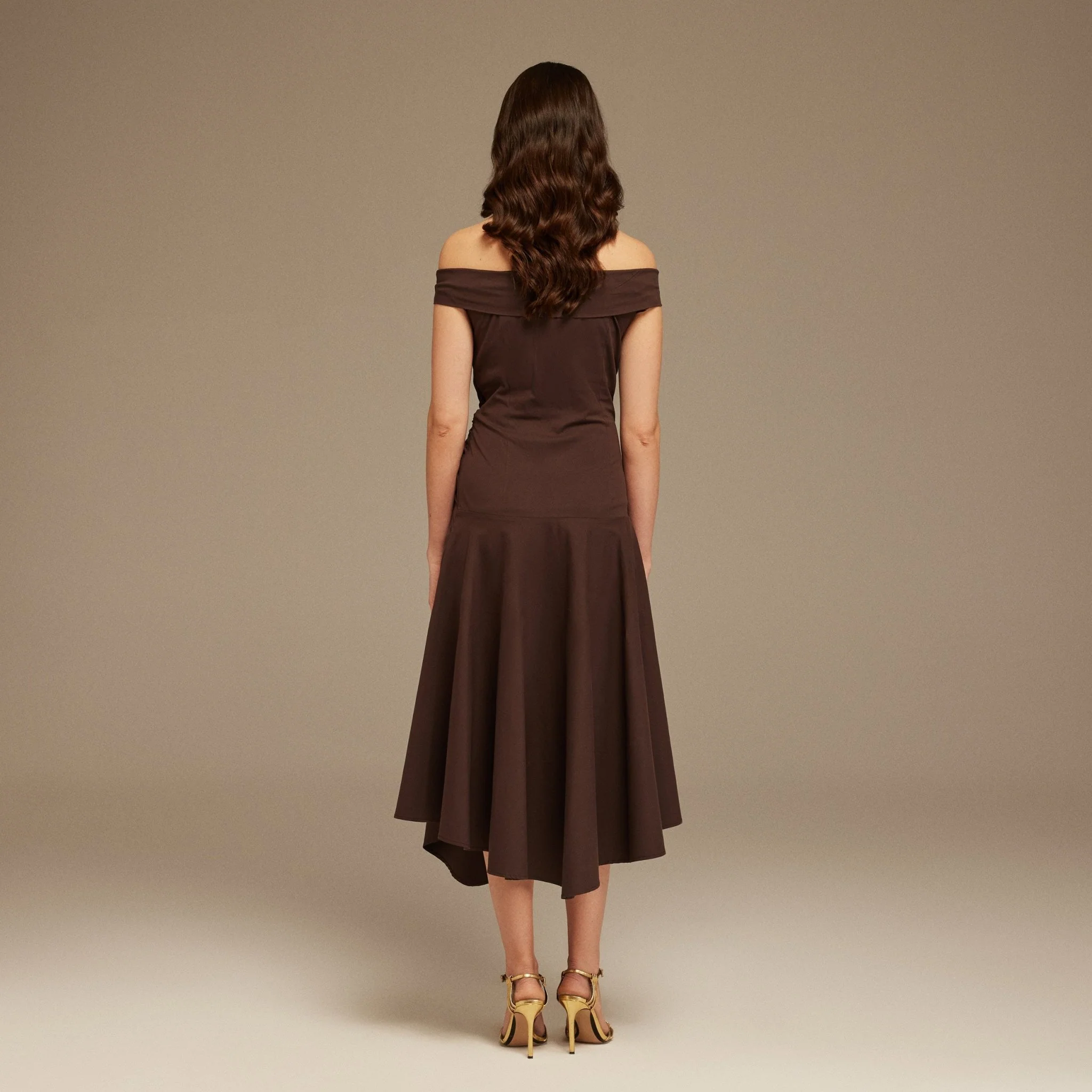Brown Off-Shoulder Cotton Ruched Midi Dress