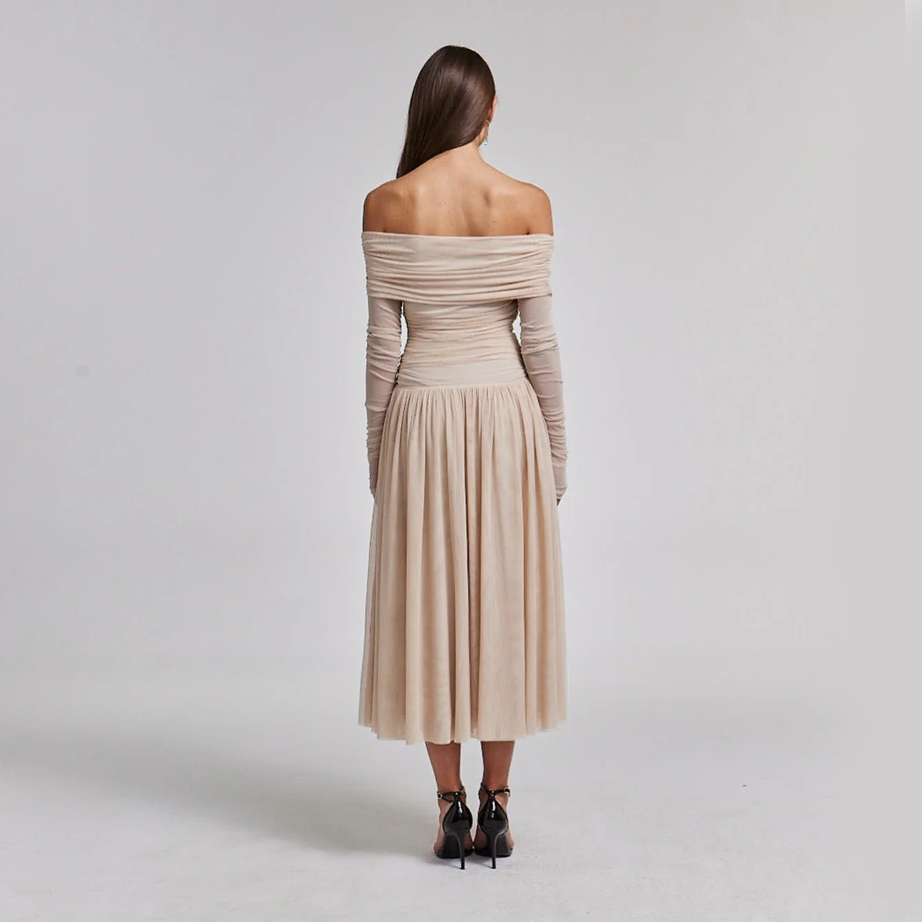 A modern take on occasion wear, this off-shoulder tulle midi dress is crafted from soft stretch tulle that hugs the body without feeling restrictive. The gathered bodice enhances the shape through subtle texture, while the A-line skirt flows lightly with each step. Extra-long fitted sleeves add contrast and a sleek finish.